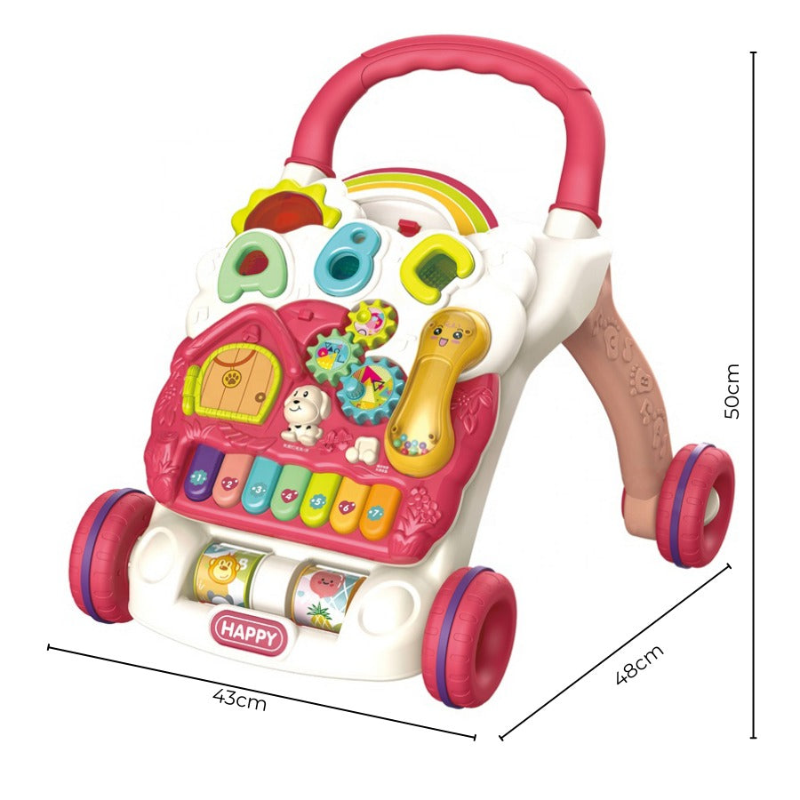 أبعاد المشاية: 50×48×43 سم، بتصميم مريح وآمن مع عجلات ثابتة.